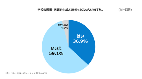 また、学校での活用経験については、約4割の小学生が「授業や宿題で生成AIを使ったことがある」と回答しており、教育現場でも生成AIの導入が進んでいる様子がうかがえる。