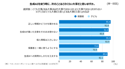 最後に、生成AIを使うときに大事だと思うことを聞いたところ、子供も保護者もともに「個人情報を入力しない」が最も高い割合となった。ほかにも「正しい情報かどうかを確かめる」や「生成AIが書いた文章をそのまま使わない」といった意識も高かった。