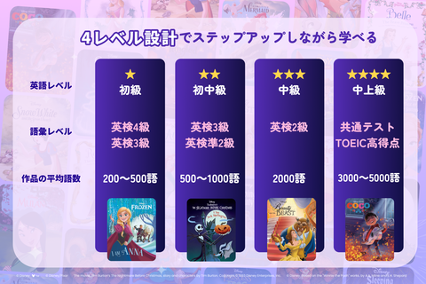 そのほか、ディズニープリンセス作品である『シンデレラ』『リトル・マーメイド』『塔の上のラプンツェル』も『美女と野獣』と同様に、2つのレベルで段階的に学習できる。