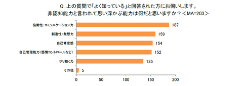 非認知能力を「よく知っている」と回答した人に、非認知能力と言われて思い浮かぶ能力は何かを聞いたところ、「協働性・コミュニケーション力」の回答が最多となった。次いで、「創造力・発想力」「自己肯定感」などが非認知能力として認識されている傾向が見られる。
