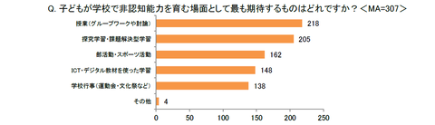 非認知能力を育成する場としては、「授業(グループワークや討論)」に最も期待が集まり、次いで「探究学習・課題解決型学習」「部活動・スポーツ活動」などが挙げられた。