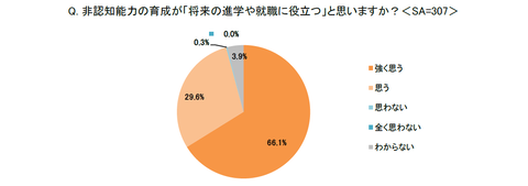 同様に、「強く思う」と「思う」の回答を合わせると、9割以上の保護者が非認知が将来の進学や就職に役立つと肯定的に評価した。