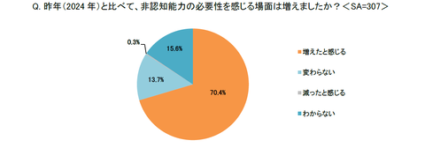 2024年と比べて、非認知能力の必要性を感じる場面は増えたかを聞いたところ、「増えたと感じる」と回答した親は7割以上にのぼった。非認知能力の重要性と有用性を認識する親が増加していることから、社会が変化する中で、その重要性はますます増大していることがうかがえる結果となっている。