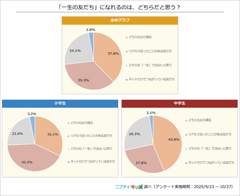 「一生の友だち」になれるのはリアルの友人かネッ友かという質問では、小学生では「リアルで会ったことがある友だち」が最多だったが、中学生では「どちらもなり得る」と考える割合が最も多く、年齢による意識の違いが表れている。