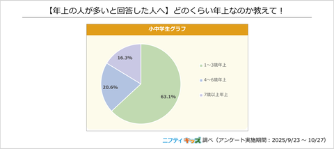 ネッ友の年齢に関する設問では、「1~3歳年上」(63.1%)が最多で、「4~6歳以上」が20.6%、「7歳以上年上」は16.3%という結果となった。