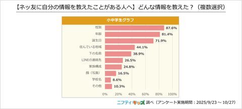 また、ネッ友に対して自分の情報を教えたことがあると回答した割合は、小学生が76.7%、中学生は87.5%となっており、大多数が自分の情報を教えたことがあることがわかった。