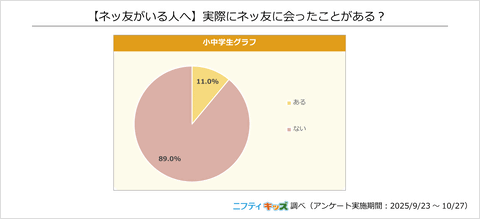 一方で、ネッ友に実際に会ったことがある人は11.0%にとどまり、大多数は対面経験がないまま交流を続けている。