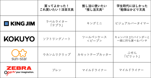 「推し活に使いたい“推し活文具”」に関するアンケートでの各社の第1位は、コクヨ「ツールペンケース<ピープ>」、キングジム「キングミニ」、サンスター文具「カセットテープカッター」、ゼブラ「マイルドライナー」となっている。これらの文具は、推し活の中で重宝されるカラーバリエーションや、推しを見せる、推し活の思い出を整理できるという点などが評価された。