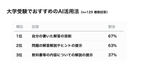 今ならこう使いたいという使用用途のTOP3は、1位「自分の書いた解答の添削」(68%)、2位「問題の解答解説やヒントの提示」(63%)、3位「教科書などの内容についての解説の提示」(37%)だった。