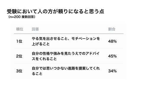 受験において人の方が頼りになると思う点の1位は「やる気を出させること、モチベーションを上げること」(48%)だった。2位は「自分の性格や強みを見たうえでのアドバイスをくれること」(45%)、3位は「自分では思い付かない進路を提案してくれること」(34%)だった。