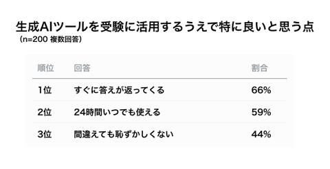 生成AIツールを受験に活用するうえで特に良いと思う点TOP3は、1位「すぐに答えが返ってくる」(66%)、2位「24時間いつでも使える」(59%)、3位「間違えても恥ずかしくない」(44%)だった。