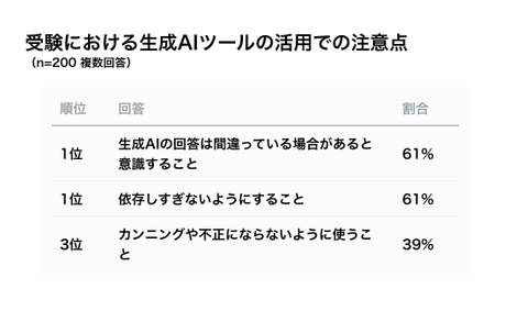 受験における生成AIツールの活用での注意点は、「生成AIの回答は間違っている場合があると意識すること」(61%)や、「依存しすぎないようにすること」(61%)などがあがった。