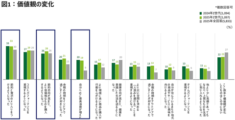 価値観の変化については、「節約と贅沢のメリハリを付けるようになった」との回答が昨年に続き最多となった。Z世代の「節約志向が高まり、より低価格なものを購入するようになった」という価値観は昨年よりも増加しているが、ほかの世代に比べて「ご褒美消費」への意欲が高いことが特徴となっている。