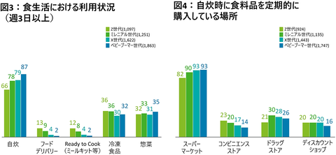 また、Z世代はほかの世代と比べると頻度は低いものの、6割以上が週に3日以上自炊を行っており、若年層でも自炊が一定の習慣として定着している。ミールキットなどの「Ready to Cook」や「フードデリバリー」の利用もほかの世代より高く、Z世代の中でも特に20代前半の利用率が高くなっている。