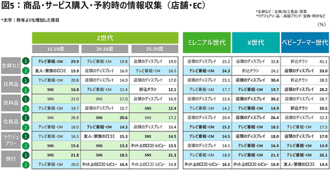 商品・サービス購入・予約時に参考にしている情報源については、商品カテゴリーや世代を問わず「テレビ番組・CM」が上位に挙げられた。