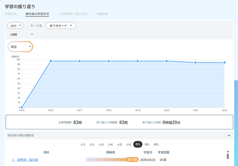 キミノスタディでは、正答率の他に「理解度」という指標を設けている。1問1問に対して〇か×だったかではなく、単元に対する「理解度」で生徒を見ることで、先生の評価と、実際の試験での得点率とのギャップを減らすことができるという。そのうえで、一人ひとりの学習履歴をAIがリアルタイムに学習し、理解度を伸ばせる問題を出題していく。