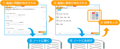 キミノスタディは、学習におけるアウトプットと問題演習をサポート。画面に表示される問題をノートに解き、画面に表示される解答を見てノートに丸付けをし、丸付けの結果を入力したら次の問題へ進む、というのが基本の流れになっている。
