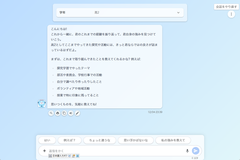 このうち「強み発見サポート」についてはお試し利用ができるほか、実際に利用している教員から「人前で自己表現が苦手な生徒でも、AIに対しては素直に本音を入力できるため、忖度なく自分を見つめ直すことができ、質問に答える中で、思ってもみなかった強みに気付くことができる」との評価を得ている。