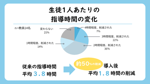 一方、教員側では、生徒一人あたりの指導時間が平均3.8時間から1.8時間に減少し、約50%の削減を実現。志望理由書の作成前段階をAIが担うことで、教員は添削や最終指導に集中できるようになるという。