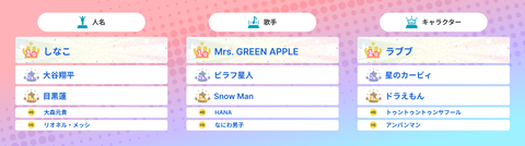 画像検索では、人名部門で原宿系クリエイターの「しなこ」氏が1位に入り、2位に野球選手の大谷翔平氏が続いた。歌手部門では「Mrs. GREEN APPLE」や「Snow Man」「なにわ男子」などが上位にランクインし、キャラクター部門では耳とギザギザの歯が特徴の「ラブブ」が新たに登場。SNSなどを通じて流行したワードが検索数に反映されている。