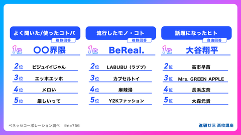 高校生の間で流行したコトバ・モノ・ヒトについては、「自分の属する世界」を指し示す言い回しとして「〇〇界隈」が1位を獲得している。流行したモノ・コトでは、“等身大の発信”が特徴のSNS「BeReal.」が1位に。さらに「LABUBU(ラブブ)」や「カプセルトイ」など、癒やしや小さな楽しみを求めるアイテムが上位となった。話題になったヒトでは、大谷翔平選手が1位で、高市早苗首相が2位となっている。