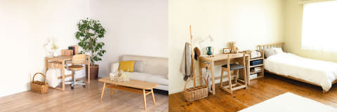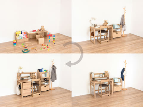 未就学児向けのキッズデスクは、幼児期には低めのデスクとしてお絵かきや知育遊びに使い、小学校入学後は向きを変えてランドセルラックとして使用可能。収納アイテムも、学年が上がって持ち物が増えるタイミングで買い足せるため、その都度「買い替える」のではなく、手持ちの家具を生かして環境をアップデート可能だ。