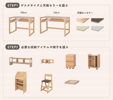クレッタはこうした課題を踏まえ、「小さく始められて、子供が成長しても買い替えずに使い続けられる家具」という新しい価値を提案。デスクの横幅(100cm/120cm)、天板カラー、収納アイテムを自由に組み合わせできる構成とした。