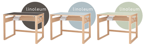 天板は、天然木ナラ突板の「ナチュラル」と、環境配慮素材リノリウム3色(ブルー/グリーン/ブラウン)の計4色展開。ナラ材は、傷が付きにくく耐久性が高い一方で、繊細な木目がインテリアになじみやすい。リノリウム天板は、抗菌性と耐久性を備え、さらさらとした独特の手触りが特長だ。