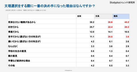 文理選択の決め手になったことを文理で分けて分析すると「将来なりたい職業があるから」は理系が48.2%で、文系より22.2ポイント高くなった。一方、「苦手だから(選ばなかった科目が)」は文系の生徒が20.5%選んでおり、理系と17ポイントの差が出た。