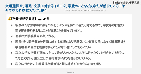 学費・経済的負担については24件。理系は学費が高いという声や、支援を手厚くしてほしいという声などが集まった。