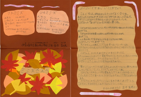金井さんの手紙は、学校の畑で出会うミミズが、土壌を耕したり肥料を作る役割をすることから感謝を述べ、ミミズが農薬や高い気温が苦手と知ったことで家族を巻き込んで無農薬野菜栽培に挑戦することや、節電や節水について考えて実行することをミミズに語りかけている。