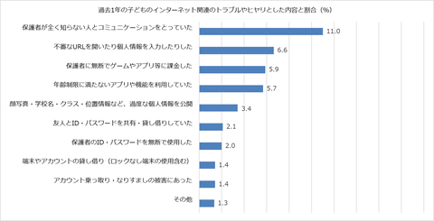 トラブルやヒヤリの内容として、「保護者が知らない人とコミュニケーションをとっていた」が11.0%、「不審なURLを開いたり個人情報を入力したりした」が6.6%、「保護者に無断でゲームやアプリなどに課金した」が5.9%となった。子供が保護者の想定外の使い方をして、トラブルやヒヤリとしたケースが上位を占めている。