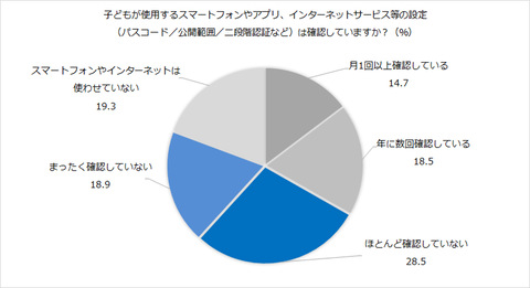 その一方で、「まったく確認していない」または「ほとんど確認していない」と回答した保護者が47.4%と、SNSの公開範囲や、アプリ課金の設定が意図しない設定になっている可能性も高い。