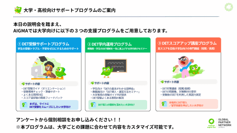 AIGMAのカリキュラムは、AIを活用した学習指導とDET攻略メソッドを組み合わせており、大学の正規授業や高校の課外講座としての活用が可能だ。AIGMAは、DET受験の支援拡充を目指す教育機関が増えていることを受け、DET受験サポートプログラム・DET学内運用プログラム・DETスコアアップ講座プログラムの提供も開始する。