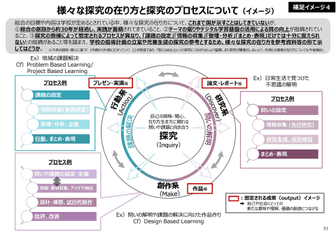 さらに、探究は総合的な学習・探究の時間のみに限定されるものではなく、各教科の学びと相互に連携するイメージや、さまざまな探究のあり方と探究のプロセスに関わるイメージも資料で提示された。