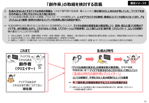特に、興味・関心に基づくアイデアを試行錯誤しながら作品(アプリケーションや具体物)として創り上げる「創作者(クリエイター)」としての経験を積み重ねていくことが重要とし、「創作系」の取り組みに関する意義が示された。