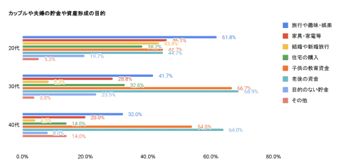 貯金や資産形成の実施有無を聞いたところ、全体の75%以上が「実施している」と回答。貯金や資産形成の目的については、20代は直近の生活を意識した内容が中心であるのに対し、30代以降は子供の教育資金や老後資金へと移行。30代では教育資金を目的とした貯蓄が66.7%、老後資金が68.9%に達し、将来への備えが家計の大きなテーマとなっている。