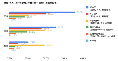 出産を希望しながら、「持てない」「悩んでいる」と回答した層の分析結果によると、20代は資金面を課題に挙げた割合が100%に達したほか、キャリア形成(66.7%)に関する悩みも大きい。30代では、資金面(84.2%)に加え、年齢・健康(55.3%)の2点が大きな障壁となっていることがわかった。