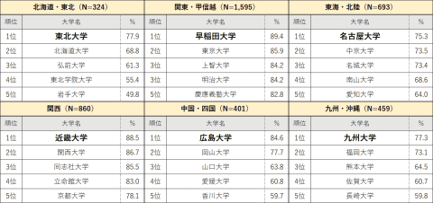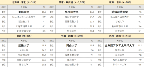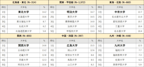 エリア別大学認知度ランキングにおいて、関東・甲信越エリアでは前回2位だった早稲田大学が1位となり、関西エリアは近畿大学が4年連続1位となった。そのほかのエリアでは国立大学が上位にランクインし、北海道・東北エリアは東北大学、中国・四国エリアは広島大学が1位を獲得している。