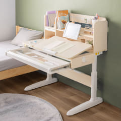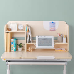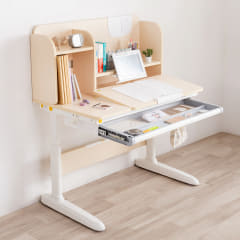 また、正面のシェルフにタブレットスタンドを設けており、タブレットを目線の高さに設置できるほか、教科書を開いたまま立てかけておくこともできる。さらに、電源タップを床に転がすことなく机のフレーム上に置いておけるトレーも装備。デジタル学習に対応し、現代の学習スタイルに適した設計とした。