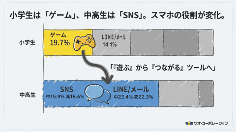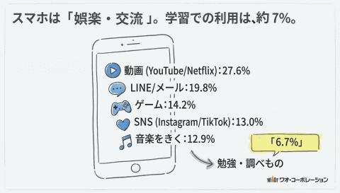 デジタルデバイスの利用目的に関しては、「動画視聴」が全学年で最も多く27.6%を占めた。次いで小学生では「ゲーム」、中高生では「LINE」や「SNS」の利用が増え、学年によって利用目的が変化している。一方で、学習目的での利用は全体で6.7%と少数にとどまった。