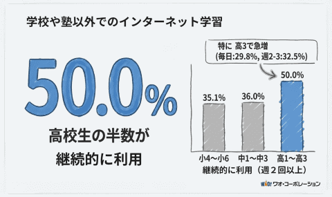 学校や塾以外でのインターネット学習について聞いたところ、「週2回以上の継続利用」が全体で39.5%となっている。学年別では小学生が35.1%、中学生で36.0%、高校生では50.0%と、学年が上がるにつれて利用頻度が高まる傾向にある。ただし、「使ったことはあるが、今は使っていない」「一度も使ったことがない」といった未活用層も18.9%存在し、インターネット学習が習慣として定着しているとは言いがたい。