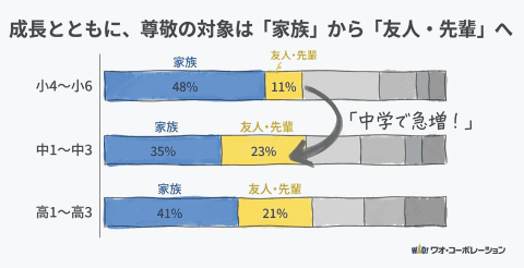 「尊敬する人」に関する設問では、全学年で「お母さん」が最多の回答となった。続いて「友だち」「お父さん」が続き、全体の42.7%がこの3項目に集中している。また小学校から中学校に上がるにつれて、尊敬の対象が家族中心から「友だち・先輩」へ比重が移る傾向が見られた。