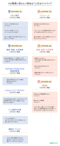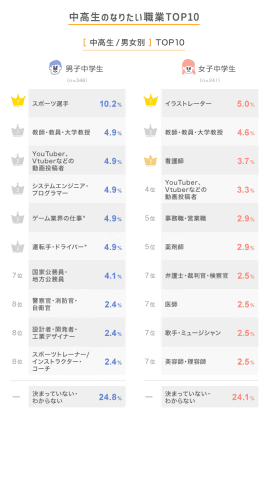 一方で、中学生の傾向は異なり、男子中学生の1位は「スポーツ選手」、女子では「イラストレーター」が最多だった。男子中学生では、YouTuberやVtuberなどの動画投稿者やゲーム業界の仕事、運転手なども人気を集めている。