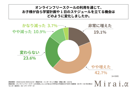さらに、学習計画や1日のスケジュールを立てる機会については、「やや増えた」(42.7%)と「非常に増えた」(19.1%)の合計で、保護者の61.8%が自発的に学習計画や1日のスケジュールを立てるようになったと回答した。