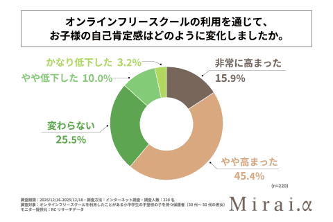 合同会社Mirai.yは、オンラインフリースクールの利用経験がある不登校の小中学生の保護者を対象に、「オンラインフリースクールの利用による子供の変化に関する調査」を実施した。対象は30代から50代の保護者220名。