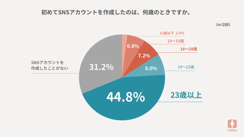 SNSを初めて利用した年齢を聞いたところ、「23歳以上」が44.8%と最も多かったが、「16〜18歳」は7.2%、「13〜15歳」が6.8%、「12歳以下」も2.0%存在しており、未成年からのSNS利用も一定数確認された。