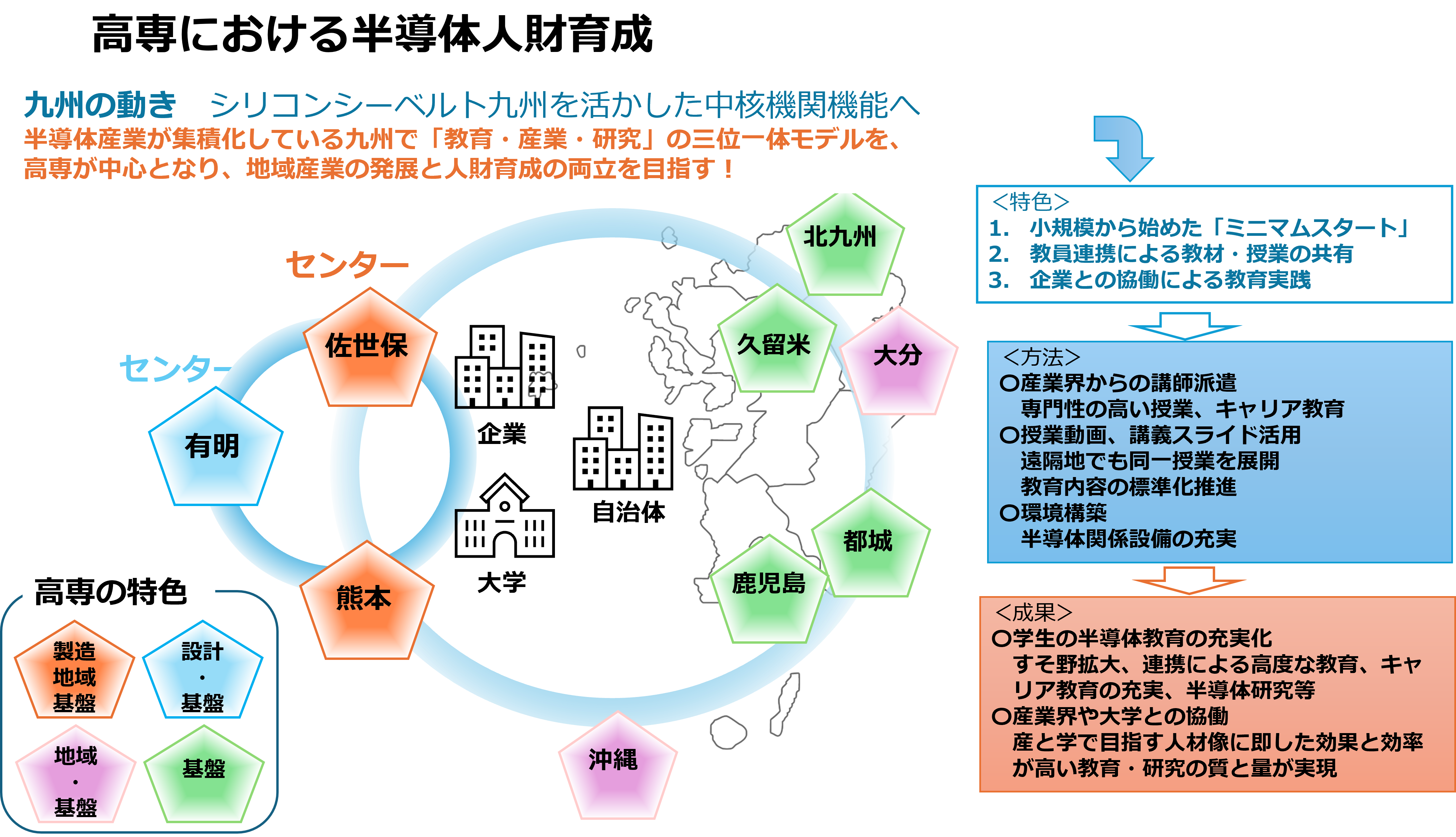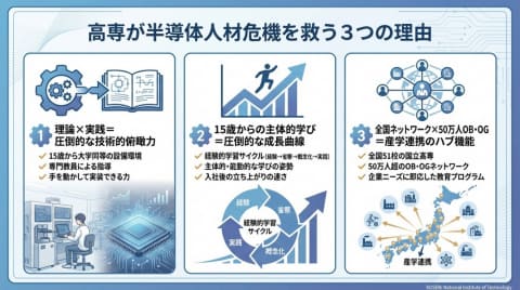 同構想は、半導体人材不足への対策として、地域に根ざした高専の特性と全国ネットワークを生かした取り組みである。高専では15歳から実践的な技術教育を提供しており、「即戦力×応用力×イノベーション力」を備えた人材を育てる独自の教育体制を持つ。