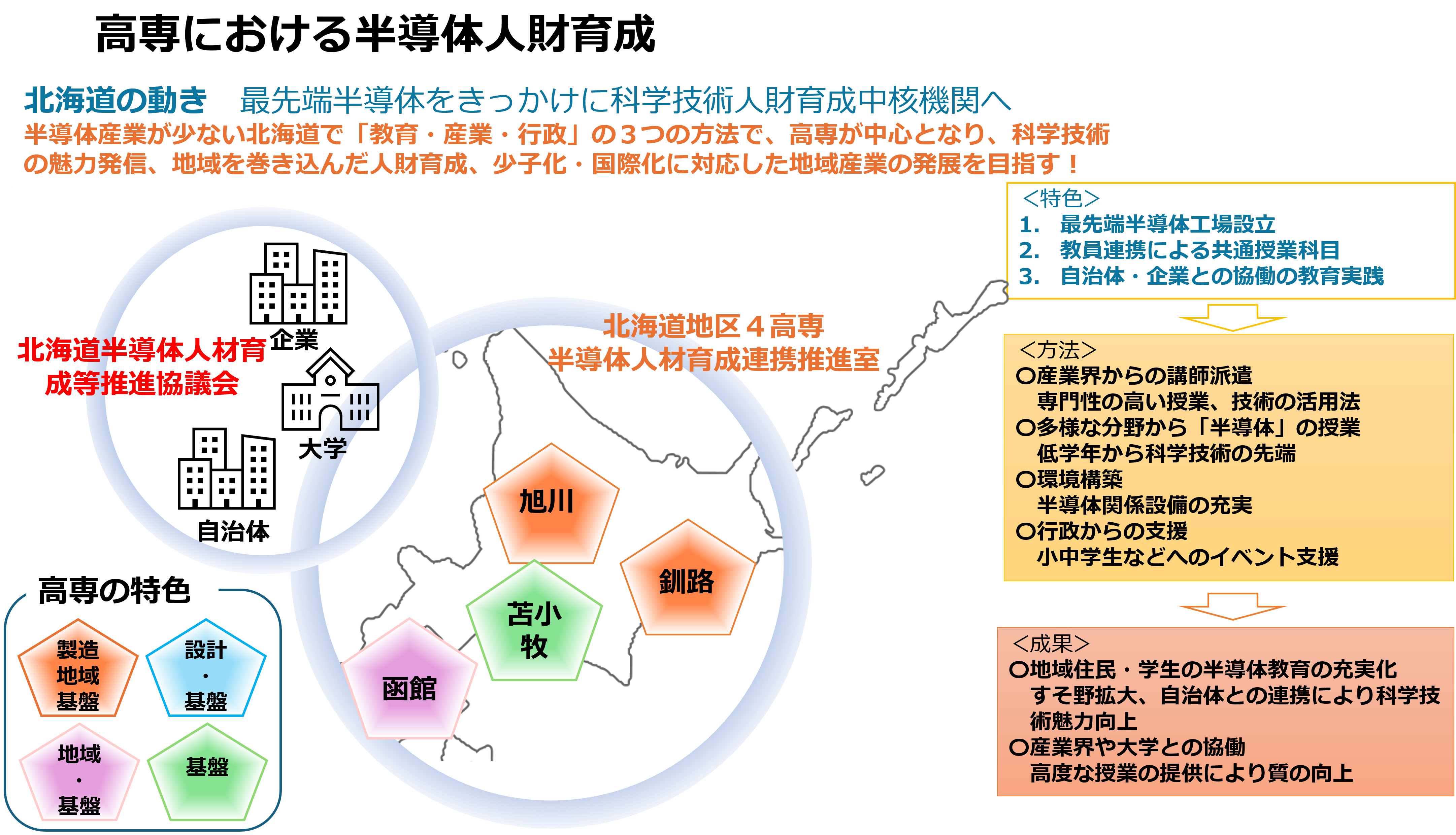 北海道では、Rapidus株式会社の最先端半導体工場設立を契機に、旭川高専、釧路高専、苫小牧高専、函館高専が「北海道地区4高専半導体人材育成連携推進室」を設立。小中学生向けイベントや自治体・企業と協働した地域全体での人材育成を展開中だ。