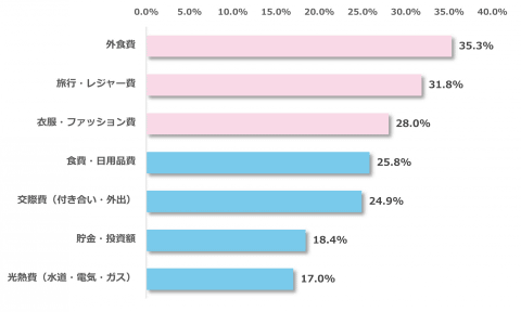 教育費の捉え方については、「削りにくい」と回答した保護者が84.6%にのぼり、外食やレジャー費を削って教育費を優先している家庭が多い。特に「外食費を削った」と回答した保護者が35.3%と最も多く、続いて「旅行・レジャー費」が31.8%、「衣服・ファッション費」が28.0%となった。